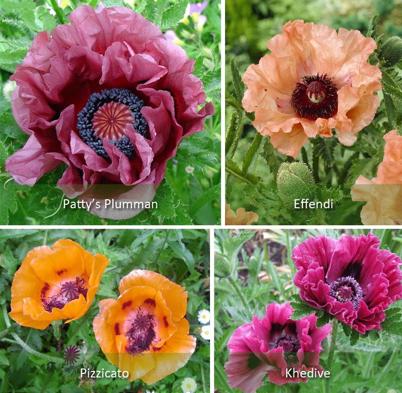 Φωτεινά κατακόκκινα άνθη μεγέθους έως 20 cm με μαύρο κέντρο. Έχουν αναπτυχθεί ποικιλίες χρώματος κοραλλί με ένα μικρό σκούρο κέντρο, με άνθη που κυμαίνονται από λευκό-στάχτη έως απαλό ροζ. Απαγορεύεται η καλλιέργεια. |