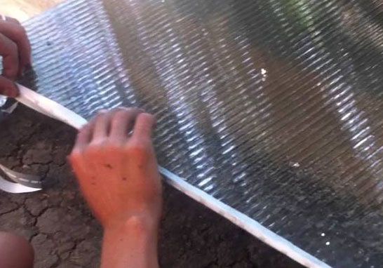 - Τοποθετήστε τα μέσα, διπλώστε τις άκρες του υλικού στέγης προς τα μέσα (μπορούν να στερεωθούν στις δοκούς με συρραπτικό κατασκευής).