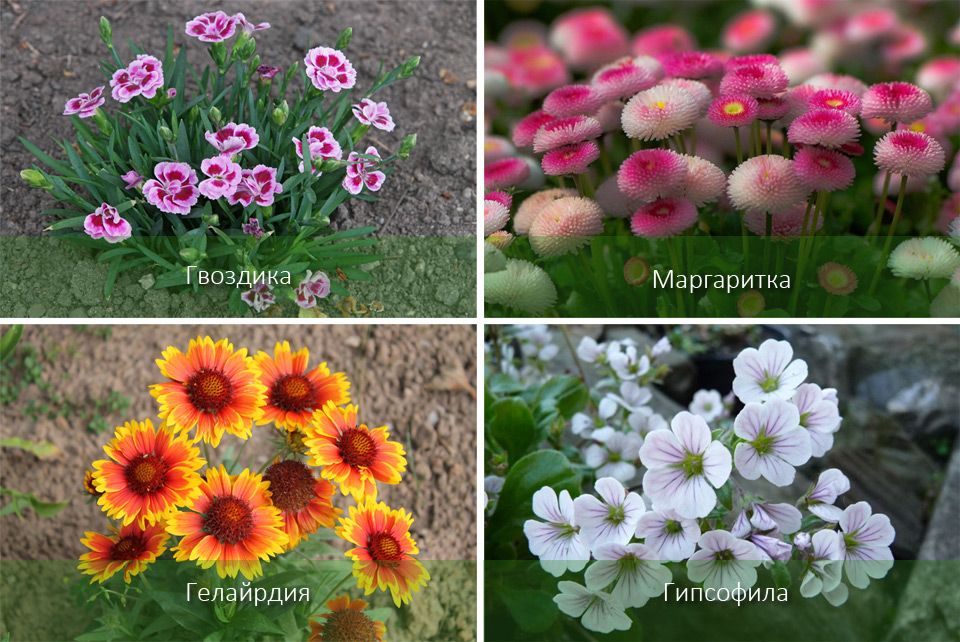 Μεταξύ των φυτών χαμηλής ανάπτυξης, τα ακόλουθα είναι ιδιαίτερα δημοφιλή: γυψόφιλα, μαργαρίτες, γαρίφαλα, γεντιανή, γαϊλαρνδιά (Υπάρχουν ψηλές ποικιλίες). Τα πολυετή άνθη μπορούν να σας βοηθήσουν να δημιουργήσετε έναν κήπο, εξοικονομώντας χρόνο και χρήματα. Τα υλικά φύτευσης πρέπει να αγοράζονται από ένα εξειδικευμένο κατάστημα.