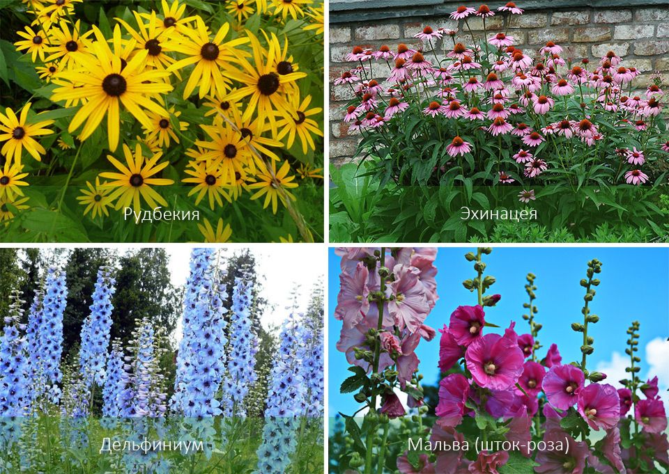 - Ρουντμπέκια – οι φωτεινές κίτρινες, τερακότα και κοκκινωπές ταξιανθίες είναι πυκνές. Αυτό το φυτό απαιτεί τακτικό πότισμα και πλήρη ηλιοφάνεια. Ανθίζει από τον πρώτο μήνα του καλοκαιριού μέχρι τον παγετό.