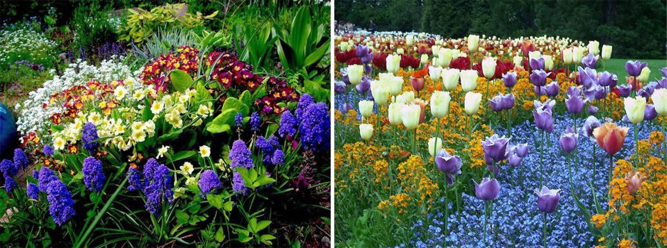 Την άνοιξη, τα λουλούδια ανθίζουν, συμπεριλαμβανομένων των μονοετών και διπλών πρώιμων ποικιλιών. Οι τουλίπες συχνά συνδυάζονται με αειθαλή πολυετή φυτά σε παρτέρια. Συνήθως δεν υπερβαίνουν τα 40 εκατοστά σε ύψος.