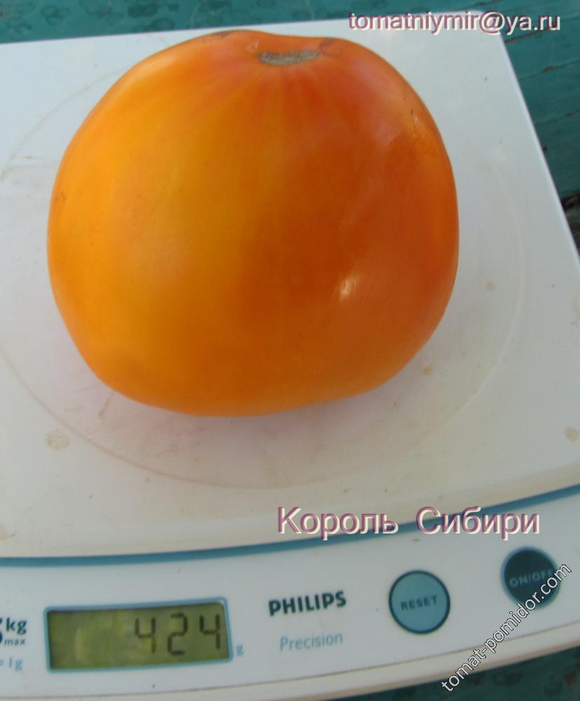 Οι ντομάτες King of Siberia είναι αρκετά μεγάλες, με βάρος μεταξύ 400 και 800 γραμμαρίων. Ο καρπός μικραίνει καθώς ανεβαίνετε στο φυτό. Έχουν σχήμα καρδιάς και ελαφρώς ραβδώσεις. Είναι πιο στρογγυλές στη βάση του θάμνου παρά στην κορυφή.
