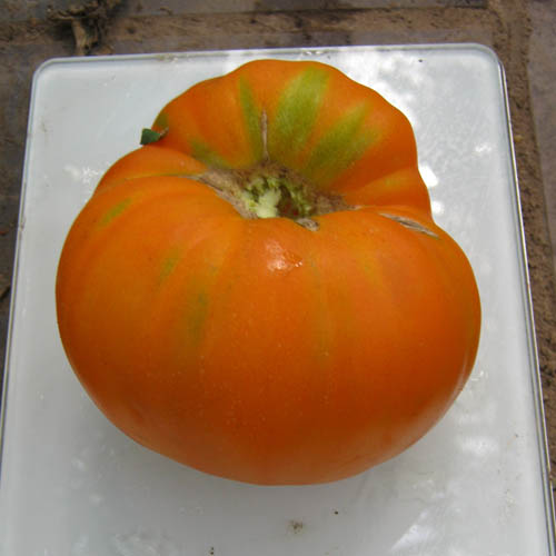 Οι ντομάτες είναι μεγάλες, πεπλατυσμένες και στρογγυλές. Οι ώριμες ντομάτες είναι πορτοκαλί. Η σάρκα έχει ροζ απόχρωση. Είναι πολύ ζουμερή, γλυκιά και παχουλή. Οι νευρώσεις είναι λεπτές. Η φλούδα είναι παχιά και γυαλιστερή, επιτρέποντας στους καρπούς να αποθηκεύονται για μεγάλο χρονικό διάστημα χωρίς να χάνουν την ποιότητά τους και να κρέμονται στο αμπέλι χωρίς να σκάνε.