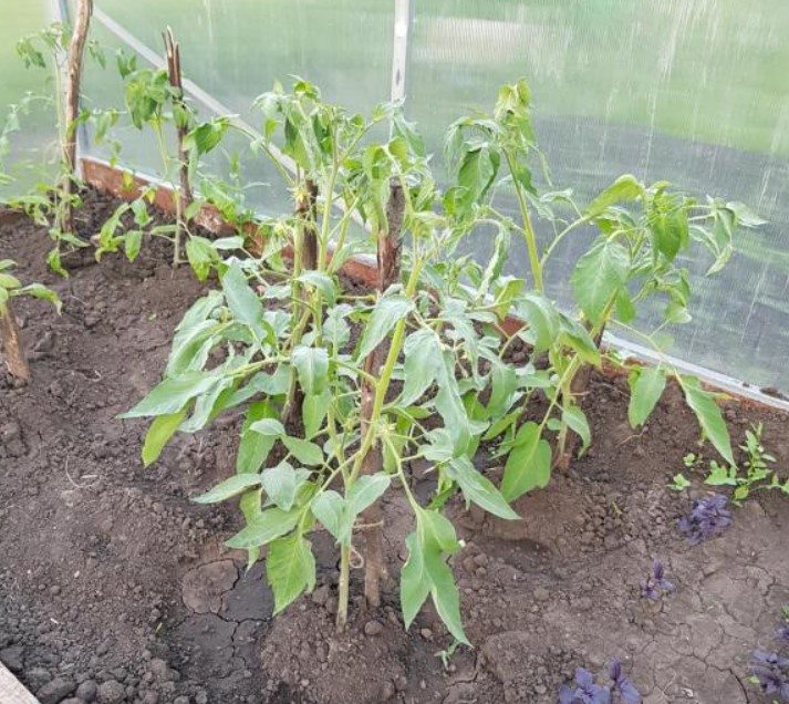 Οι ντομάτες, μαζί με το κομμάτι χώματος στις ρίζες, μεταφέρονται στην τρύπα και καλύπτονται με χώμα μέχρι τα κάτω φύλλα.