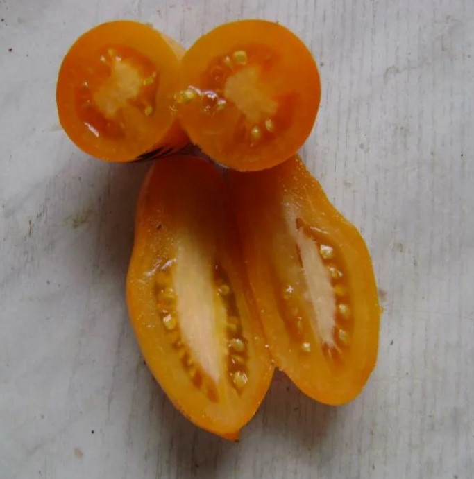 Η σάρκα είναι πολύ γλυκιά και ζουμερή, με λίγα κενά στο εσωτερικό. Δεν υπάρχουν περισσότεροι από πέντε θάλαμοι σπόρων. Οι ντομάτες έχουν κίτρινο-πορτοκαλί χρώμα, σφιχτή φλούδα και επίμηκες σχήμα με μυτερή άκρη. Δεν υπάρχει πράσινη κηλίδα κοντά στο στέλεχος.