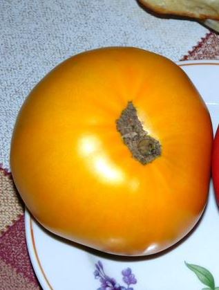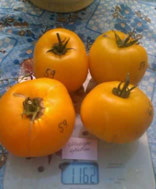 Είναι καλύτερο να τα καλλιεργήσετε σε έναν μόνο κορμό, αλλά έχω δοκιμάσει και δύο. Ένα τσαμπί παράγει 3-4 ντομάτες, αλλά ωριμάζουν στα 400-600 γραμμάρια. Ο μεγαλύτερος καρπός που έχω καλλιεργήσει ήταν 1.100 γραμμάρια. Ένας μόνο θάμνος μπορεί να αποδώσει έως και δέκα κιλά νόστιμων φρούτων. Ο καρπός είναι σαρκώδης όταν κόβεται, σχεδόν χωρίς κουκούτσια. Οι σπόροι είναι μικροί. Η γεύση είναι εξαιρετική. Συνιστάται για φρέσκια χρήση και για σαλάτες. Φυτεύω τρία φυτά σε ένα θερμοκήπιο από πολυανθρακικό. αυτό είναι αρκετό για να θρέψει μια τετραμελή οικογένεια, και η περίσσεια χρησιμοποιείται για την παρασκευή κέτσαπ. Δεν είναι κατάλληλα για τουρσί λόγω της λεπτής φλούδας τους. Τα φυτεύω εδώ και τρία χρόνια.