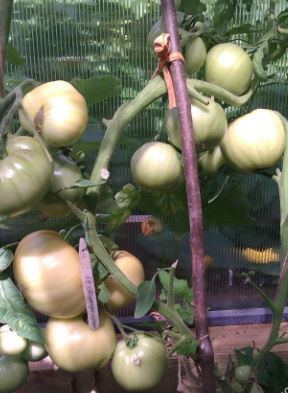 Αυτά τα φυτά ντομάτας ήταν από τα πρώτα που επηρεάστηκαν από την κλαδοσπορίωση, έτσι μέχρι τα μέσα της σεζόν είχαν απανθρακωμένα φύλλα. Ευτυχώς, τα πρώτα δύο ή τρία τσαμπιά είχαν χρόνο να δέσουν και να ωριμάσουν.