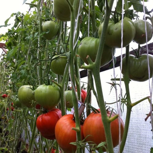 Οι ποικιλίες ήταν Red Large, Ox Heart, Orange and Red Glasses, και Orange Pear. Αγόρασα επίσης Minusinsky Giant Pink, Minusinsky Balls και Minusinsky Apple Balls από συλλέκτες. Μου άρεσαν όλες. Άλλες ήταν μεγαλύτερες, άλλες μικρότερες. Αλλά παρατήρησα ότι ήταν αρκετά πρώιμες. Το θέμα είναι ότι είχαμε παγετό -7 βαθμών Κελσίου στα τέλη Μαΐου. Οι κορυφές των ντοματών στο νέο θερμοκήπιο πάγωσαν, ακριβώς στην άκρη όπου ήταν οι Minusinsky, εκτός από την Grusha (αυτή η ποικιλία ήταν σε διαφορετικό θερμοκήπιο). Η θερμάστρα ήταν λίγο πιο κοντά στην άλλη άκρη. Έπρεπε να κόψω τις κορυφές. Εμφανίστηκαν οι πλευρικοί βλαστοί. Νόμιζα ότι αυτό ήταν όλο, δεν θα υπήρχε συγκομιδή. Άφησα δύο πλευρικούς βλαστούς. Αλλά στο τέλος, όλες καρποφόρησαν, σχηματίστηκαν αρκετά τσαμπιά, και ακόμη και μερικές ντομάτες έγιναν κόκκινες στον θάμνο, παρά το κρύο και βροχερό καλοκαίρι.