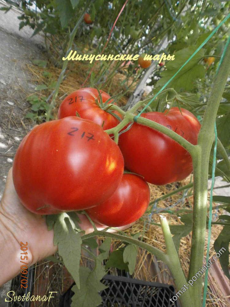 Μινουσίνσκ Μπάλες. Τοπική ποικιλία από το Μινουσίνσκ. Απροσδιόριστης φυλής, ύψους 1,7-1,9 μ. σε θερμοκήπια, οι καρποί είναι έντονο κόκκινο, με κοντές καρδιές, σαρκώδεις, γλυκοί και νόστιμοι. Τα τσαμπιά απαιτούν πασσάλους, αναπτύσσονται σε 2-3 μίσχους.