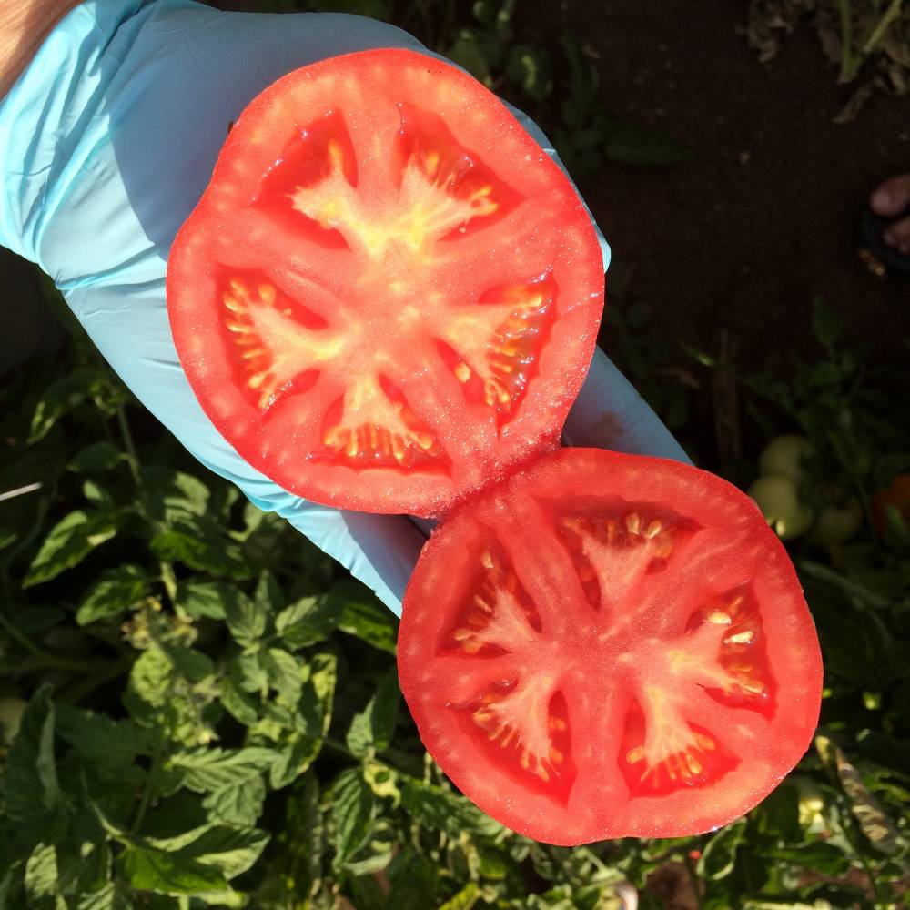 Όταν το κόβεις, βλέπεις ότι είναι ελαφρώς άγουρο. Αλλά εξακολουθεί να είναι πολύ νόστιμο. Έχει λίγο έλλειψη γλυκύτητας, αλλά νομίζω ότι αυτό φταίει το καλοκαίρι και η καταστροφική έλλειψη ήλιου. Παρόλα αυτά, οι ντομάτες του εμπορίου δεν μπορούν να συγκριθούν με τις δικές μου.
