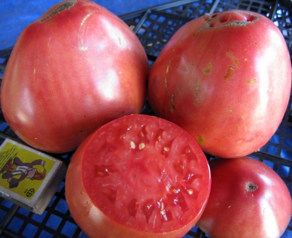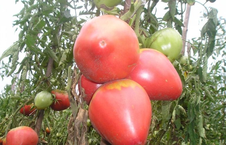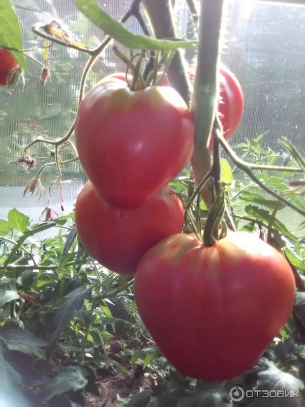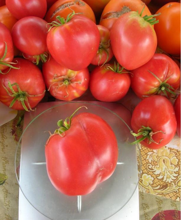 | Περιγραφή του φρούτου | Οι ντομάτες είναι μεγάλες και σε σχήμα καρδιάς. Το χρώμα τους είναι ροζ. |