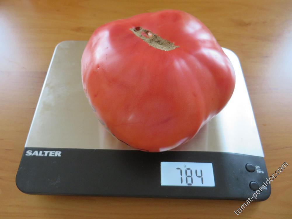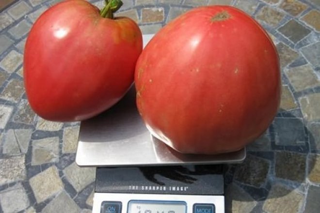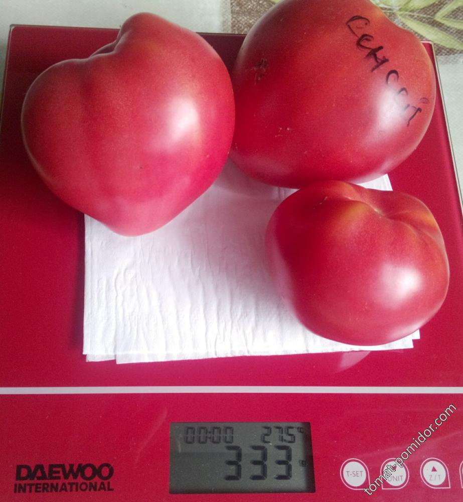 Οι καρποί της ποικιλίας έχουν σχήμα καρδιάς και είναι εντυπωσιακά μεγάλοι. Κατά μέσο όρο, μια ντομάτα ζυγίζει μεταξύ 350 και 400 γραμμαρίων, αλλά οι ντομάτες χαμηλότερης κατηγορίας συχνά φτάνουν τα 600 γραμμάρια ή και περισσότερο.