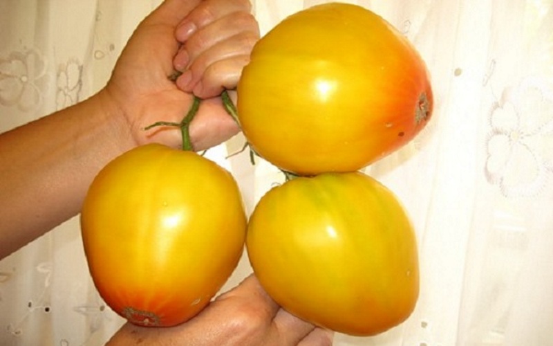Η ποικιλία αποδείχθηκε παραγωγική και ωρίμασε αργά. Οι καρποί είναι κόκκινοι-πορτοκαλί. Λόγω του κρύου και υγρού καλοκαιριού, σχηματίστηκαν πολλές μη ανεπτυγμένες ωοθήκες. Κάτω από το κοτσάνι, ένα μικρό πράσινο μπιζέλι, μεγέθους 3-4 χιλιοστών, έχει πεθάνει. Αυτά είναι ευρέως γνωστά ως "ομφαλοί". Αλλά είναι ενδιαφέρον ότι, αφού συλλέχθηκαν οι ώριμοι καρποί, αυτοί οι "ομφαλοί" άρχισαν να αναπτύσσονται και μέχρι το φθινόπωρο είχαν μεγαλώσει σε πλήρεις ντομάτες.