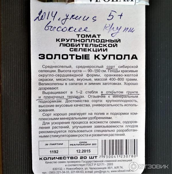 Πριν από μερικά χρόνια, διάβασα σε ένα περιοδικό κηπουρικής για μια σιβηρική ποικιλία που ονομάζεται "Golden Domes". Περιγράφονταν τόσο δελεαστικά, με όμορφες φωτογραφίες, που φυσικά ήθελα πολύ να καλλιεργήσω μερικούς μόνος μου. Οι προσπάθειές μου να βρω σπόρους στέφθηκαν με επιτυχία μόνο ένα χρόνο αργότερα. Είδα αυτά τα όμορφα φακελάκια στο κατάστημα Siberian Garden. Χάρηκα πολύ και φυσικά άρπαξα ένα.Στο πίσω μέρος υπάρχει μια περιγραφή, προτάσεις καλλιέργειας και άλλες πληροφορίες. Κρίνοντας από την επιγραφή, άρχισα να το καλλιεργώ το 2014.