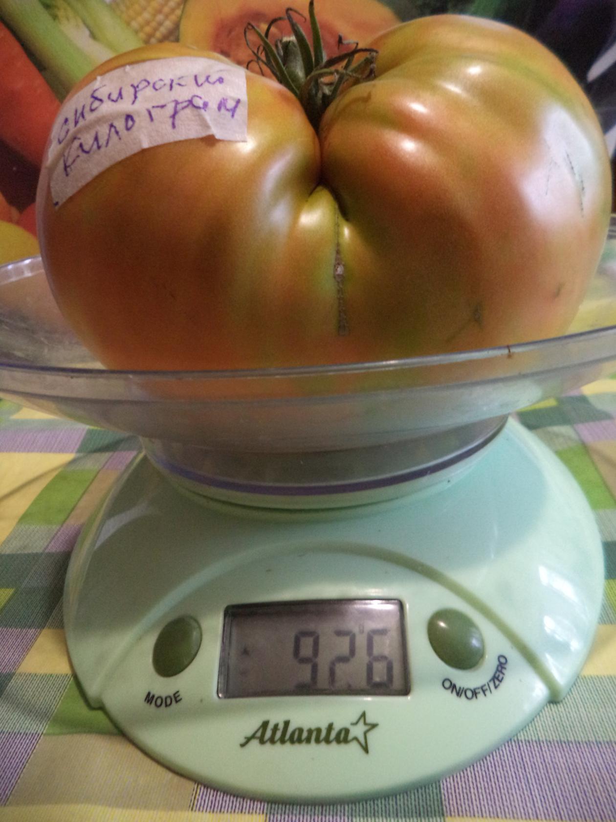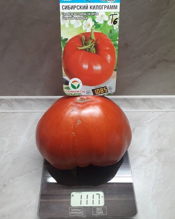 Οι ντομάτες Σιβηρικού Κιλού είναι πολύ μεγάλες, πραγματικά κορυφαίες μεταξύ των γιγάντιων ποικιλιών. Το βάρος τους κυμαίνεται από 600 έως 800 γραμμάρια, αλλά αν καλλιεργηθούν σε ένα μόνο βλαστό και ακολουθηθούν όλες οι οδηγίες φροντίδας, οι ντομάτες μπορούν να φτάσουν σε βάρος έως και 1,5 κιλό.