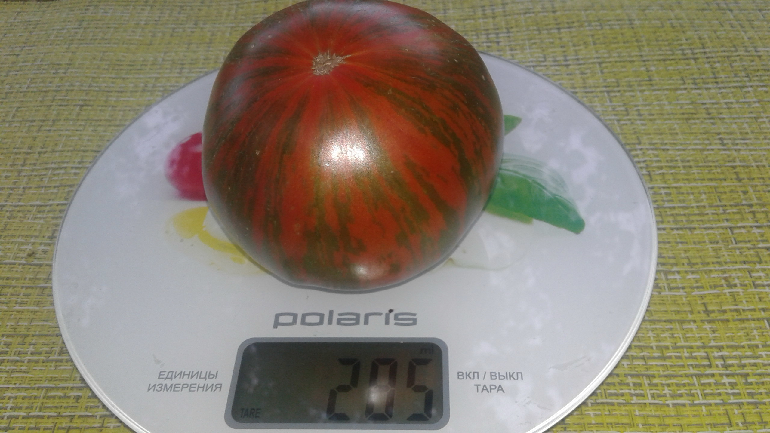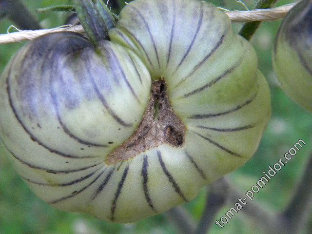 Η απόδοση των καρπών και το δέσιμο των αγγείων είναι καλά. Καθώς ωριμάζουν, οι ντομάτες γίνονται πράσινες και στη συνέχεια εμφανίζεται μια χρωματιστή κηλίδα κοντά στο κοτσάνι, η οποία μεγαλώνει καθώς μεγαλώνουν. Έχουν στρογγυλό σχήμα, ελαφρώς πεπλατυσμένο στην κορυφή.Στην αρχή δεν έκαναν εντύπωση, αλλά καθώς ωρίμαζαν άρχισαν να παίρνουν πιο ενδιαφέροντα χρώματα.