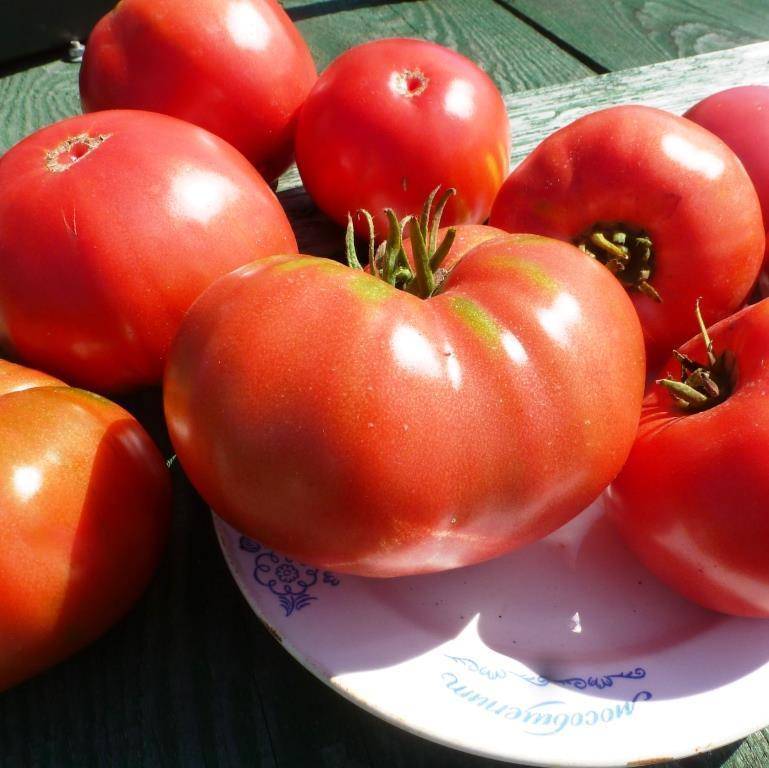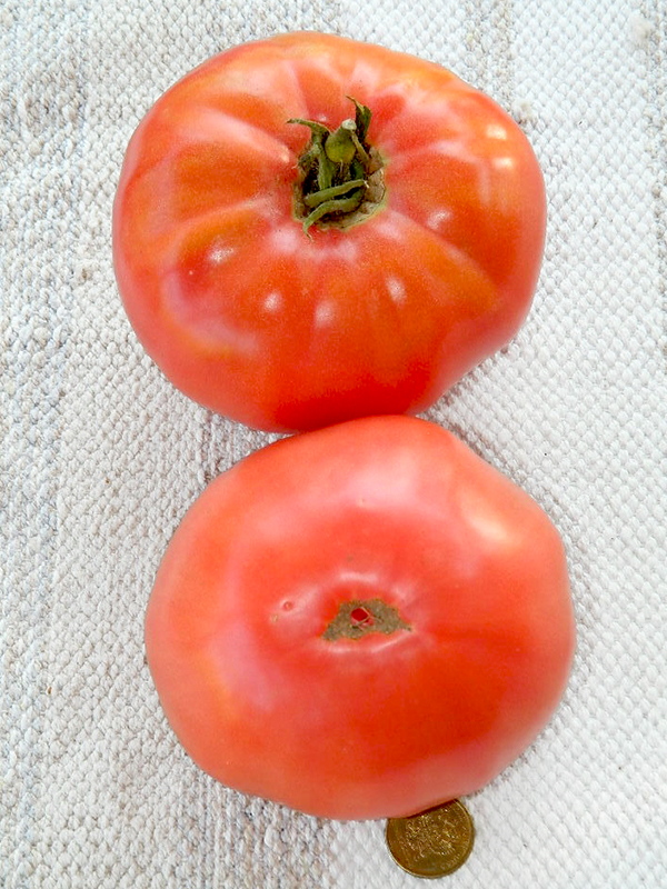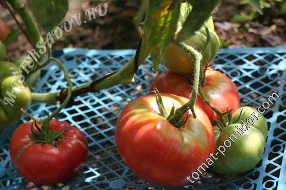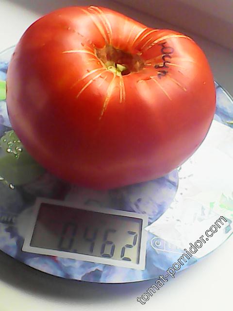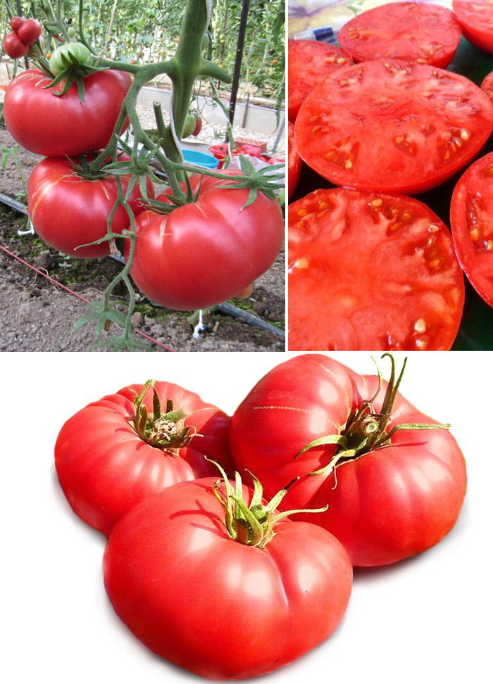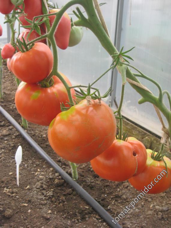 Μια όψιμη, ψηλή, απροσδιόριστη ποικιλία για θερμοκήπια. Απαιτεί πασσάλους και εκπαίδευση. Κατάλληλη για σαλάτες, χυμούς και σάλτσες. | Επίπεδο-στρογγυλό, μεγάλο, σαρκώδες, ροζ-κόκκινο, 400-800 γρ. Όταν καλλιεργείται σε ανοιχτό έδαφος, το βάρος είναι από 200 γρ. |