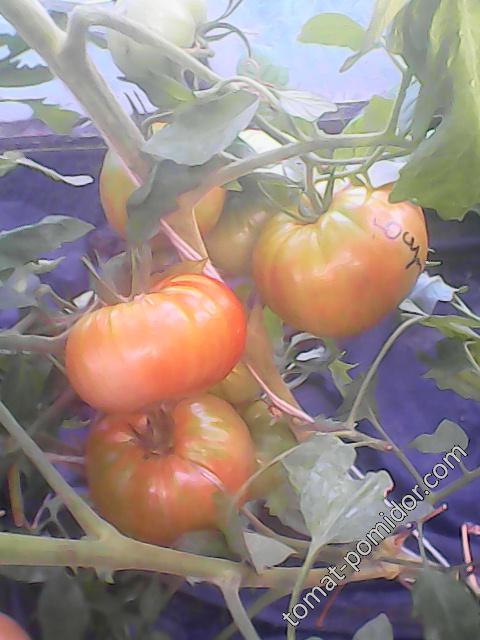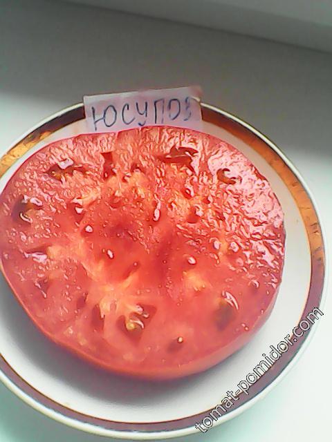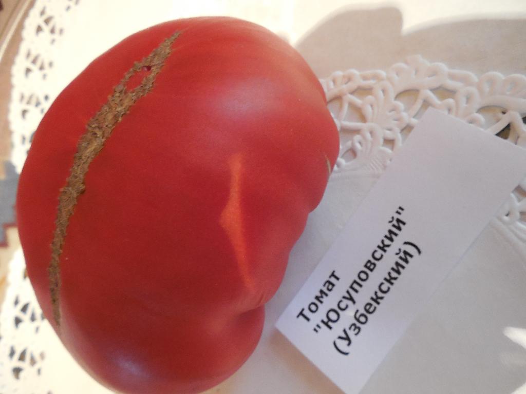 Μια παλιά ποικιλία, θρυλική. Στο Ουζμπεκιστάν, υπήρχε ένας πρόεδρος συλλογικής φάρμας ονόματι Γιουσούποφ, ο οποίος υποτίθεται ότι ήταν φίλος με τον Χρουστσόφ. Νόστιμες τοπικές ντομάτες καλλιεργούνταν στα χωράφια αυτής της συλλογικής φάρμας. Αυτή η ποικιλία ονομάζεται Γιουσούποφσκι από αυτόν τον πρόεδρο (δεν πρέπει να συγχέεται με την ευγενή οικογένεια των Γιουσούποφ, οι οποίοι, αν και συγγενείς με τη βασιλική οικογένεια, δεν έχουν καμία σχέση με αυτές τις ντομάτες). Έκανα λάθος με την ποικιλία. Έπρεπε να είχα λάβει υπόψη ότι είναι μια νότια ποικιλία και επομένως είναι απίθανο να έχει σύντομη καλλιεργητική περίοδο. Έπρεπε να την είχα φυτέψει πολύ νωρίτερα, κατανοώντας ότι χρειάζεται μια περίοδο προθέρμανσης στον καιρό μας. Αλλά ακόμα και με όλα τα λάθη μου (έκαψα ακόμη και την κορυφή της όταν έχασε την οροφή του θερμοκηπίου), η ποικιλία τα πήγε πολύ καλά.