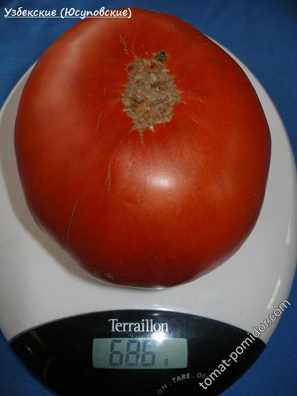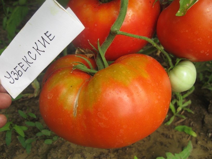 Φέτος φύτεψα ντομάτες Ουζμπέκ (Γιουσούποφ). Ήταν εντυπωσιακές! Οι ντομάτες είναι μεγάλες και αρκετά παραγωγικές. Έχουν μια καλή γεύση που θυμίζει ντομάτα, όχι πολύ ξινή. Οι δικές μου ζύγιζαν περίπου 600-700 γραμμάρια. Διατήρησαν αυτό το μέγεθος σχεδόν σε ολόκληρο το φυτό. Μόνο που μίκρυναν το φθινόπωρο, τον Σεπτέμβριο.