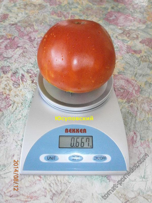 Η ντομάτα Yusupovsky είναι γνωστή για τη γενναιόδωρη απόδοσή της. Οι καρποί μερικές φορές ξεπερνούν το 1 κιλό σε βάρος. Ωστόσο, αυτό είναι δυνατό μόνο σε θερμές περιοχές. Σε άλλες περιοχές, το βάρος της ντομάτας κυμαίνεται από 200 έως 600 γραμμάρια, αλλά η γεύση παραμένει εξίσου ευχάριστη και γλυκιά.