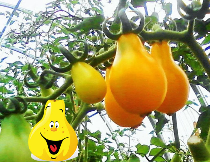 Μια μεσοπρώιμη απροσδιόριστη ποικιλία για θερμοκήπια. Κατάλληλη για σαλάτες. | Σχήμα αχλαδιού, μέτριας πυκνότητας, χωρίς νευρώσεις, κίτρινο, 40-50 γρ. Καλή γεύση. |