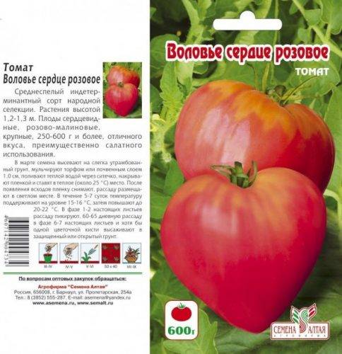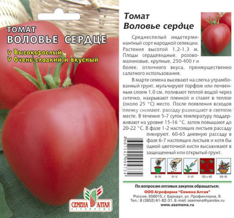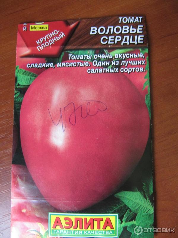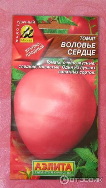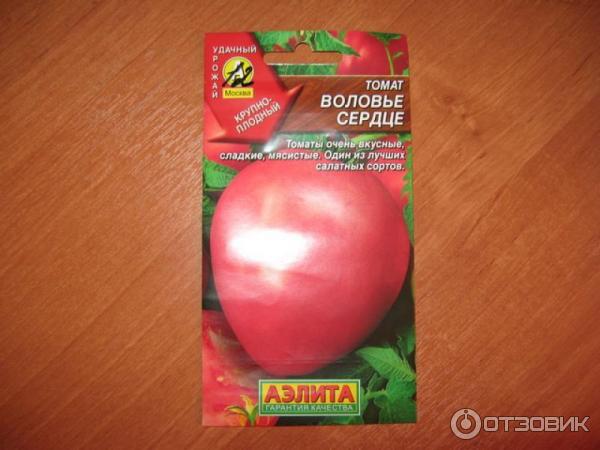 Ας ξεκινήσουμε τη γνωριμία μας με την ποικιλία "Ox Heart".Οι σπόροι είναι συσκευασμένοι σε μια πολύχρωμη σακούλα με την εικόνα μιας δελεαστικής ντομάτας.