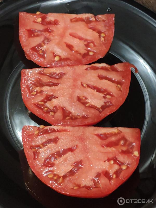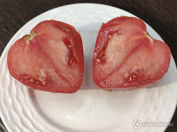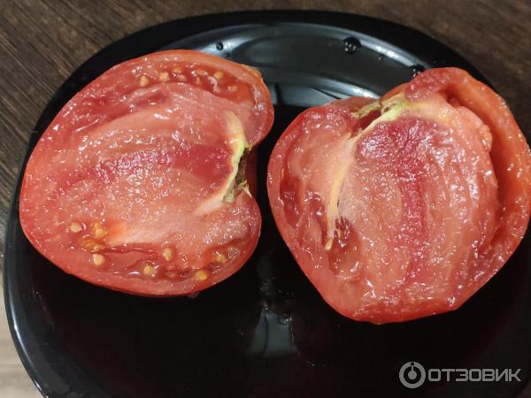 Η σάρκα της ντομάτας είναι υπέροχη και σφιχτή. Μου αρέσει που δεν υπάρχουν έντονες λευκές νευρώσεις στο εσωτερικό και δεν υπάρχει σκληρή σφράγιση γύρω από το στέλεχος.