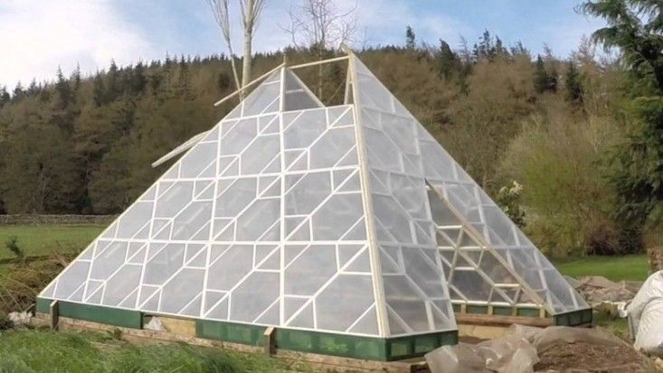 - Πυραμιδικό. Τα τοιχώματα έχουν ελαφριά κλίση προς τα μέσα και ενώνονται στην κορυφή. Αυτό το σχήμα επιτρέπει στη δομή να αντέχει σε ισχυρές ριπές ανέμου, εμποδίζοντας τη συσσώρευση χιονιού στην οροφή. Το πρωί και το βράδυ, το ηλιακό φως διεισδύει καλά, και κατά τη διάρκεια του μεσημεριανού ήλιου, οι άκρες το αντανακλούν, εμποδίζοντας την υπερθέρμανση των φυτών.