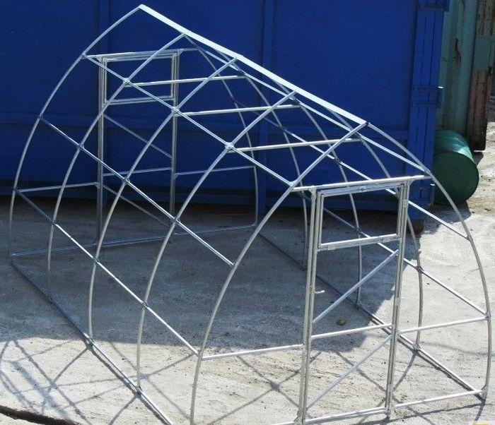 Για να δημιουργήσετε το πλαίσιο, το μεταλλικό προφίλ πρέπει να λυγίσει εκ των προτέρων σε σχήμα τόξου. Για να το κάνετε αυτό, χρησιμοποιήστε ένα κουρμπαδόρο σωλήνων για να λυγίσετε ίσια μεταλλικά προφίλ με εσοχή τουλάχιστον 7 cm στο κάτω μέρος και 4 cm στο πάνω μέρος. Αυτή είναι μια δύσκολη εργασία. Χρειάζεται τουλάχιστον μία εβδομάδα για αρχάριους. Αρχικά, δημιουργήστε ένα πρότυπο αψίδας, το οποίο θα χρησιμοποιηθεί για την κάμψη των υπόλοιπων στοιχείων. Οι ολοκληρωμένες καμάρες στερεώνονται μεταξύ τους χρησιμοποιώντας εγκάρσιες ράβδους και οι μπροστινές καμάρες συμπληρώνονται με ένα παράθυρο και μια πόρτα. Το πλαίσιο στερεώνεται στον ξυλότυπο με βραχίονες και βίδες.