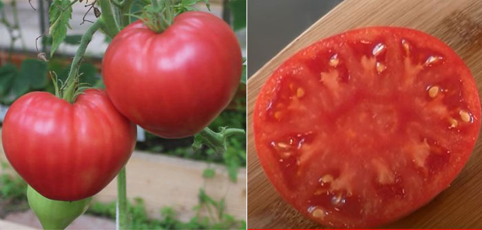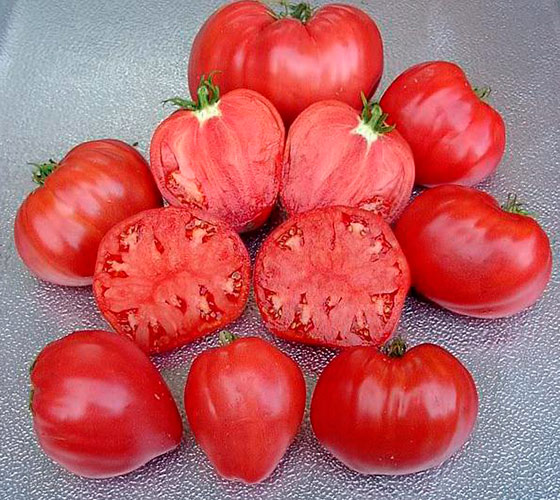 Μεσοπρόωρο, καθορισμένο, μεγαλόκαρπο, κατάλληλο για καλλιέργεια σε ανοιχτό έδαφος σε περιοχές με εύκρατο κλίμα · στη μεσαία ζώνη καλλιεργείται υπό κάλυψη ή σε συνθήκες θερμοκηπίου.Απαιτείται πασσάλωμα και διαμόρφωση. Κατάλληλο για σαλάτες και για επεξεργασία σε προϊόντα ντομάτας. | Καρδιοειδές, ελαφρώς ραβδωτό, χαλαρό, ροζ χρώματος, 150-200 γρ. Καλή γεύση. |