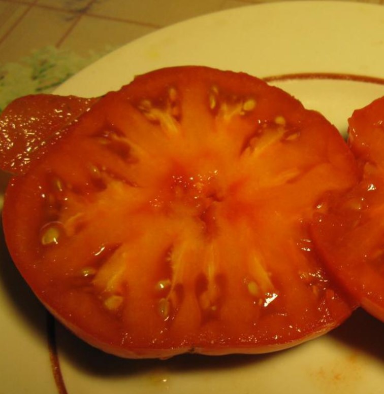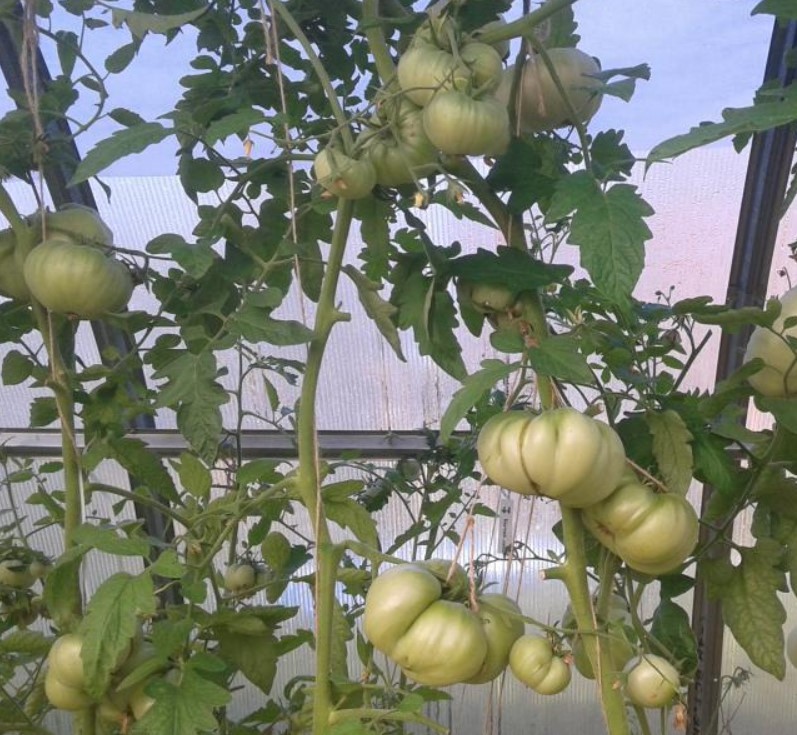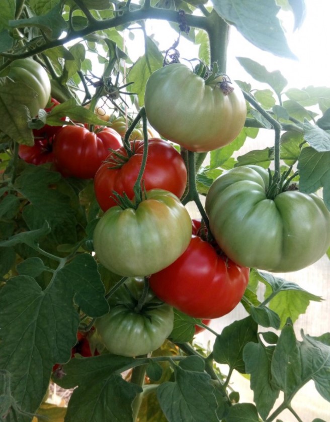 Έσπειρα τα σπορόφυτα στα μέσα Μαρτίου και η βλάστηση ήταν εξαιρετική. Τα σπορόφυτα αναπτύχθηκαν καλά και μεταφυτεύτηκαν στο θερμοκήπιο στα μέσα Μαΐου. Αν και το ύψος αναφέρεται στα 1,5 μέτρα, ο θάμνος έφτασε σχεδόν τα 2 μέτρα. Η απόδοση είναι μέτρια. Παράγει πολυάριθμους μεγάλους, όμορφα διαμορφωμένους καρπούς. Οι καρποί ωρίμασαν χωρίς να σπάσουν. Η φωτογραφία δεν αποτυπώνει πλήρως το χρώμα. στην πραγματικότητα, είναι μια πλούσια, ζωντανή ντομάτα.