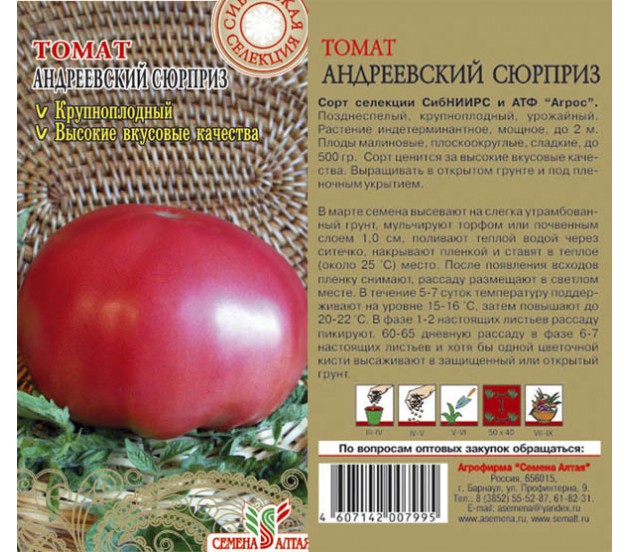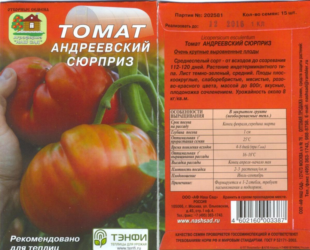 Χαρακτηριστικά της σποράς και της φύτευσης της ποικιλίας ντομάτας Andreevsky Surprise