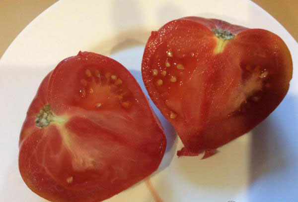 Τα φυτά ήταν πολύ ψηλά, περίπου δύο μέτρα. Πολύ καρποφόρα. Δεδομένου ότι είχα δύο φυτά αυτής της ποικιλίας, πιθανότατα μάζεψα ένα ολόκληρο κουτί με αυτές τις ντομάτες. Αλλά τις μάζεψα σταδιακά και τις φάγαμε φρέσκες. Οι ντομάτες ήταν μεγάλες, σαρκώδεις, όχι ξινές, και το χρώμα ήταν ομοιόμορφο όταν κόπηκαν. Οι ίδιες οι ντομάτες είχαν σχήμα καρδιάς. Φαινόταν πολύ όμορφες.Τα φύτεψα και εγώ ως σπορόφυτα φέτος. Η βλάστηση ήταν καλή και τα σπορόφυτα αναπτύσσονται κανονικά. Ένα άλλο πλεονέκτημα αυτής της ποικιλίας σε σύγκριση με την ποικιλία "Bull's Heart", την οποία φύτεψα πέρυσι και δεν θέλω να την ξαναφυτέψω: οι καρποί δεν υπέστησαν ζημιές από νερό που έσταζε από πάνω.
