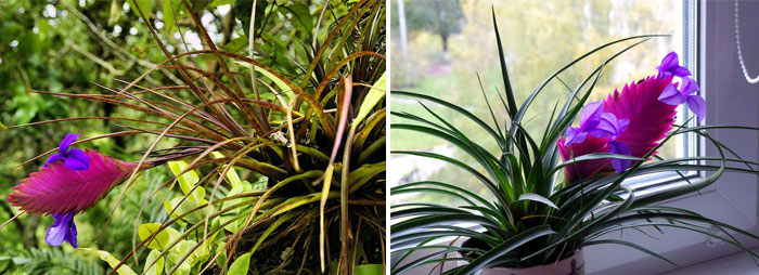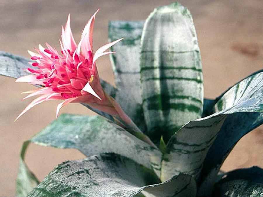 - ЕхмеяШироките листа се разпростират лъчевидно от центъра, разкривайки ярък, плътен прицветник с червен или розов цвят по време на цъфтеж, с малки цветове в пазвите му. Вирее на топъл въздух и не понася пряка слънчева светлина.