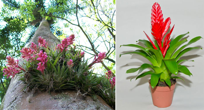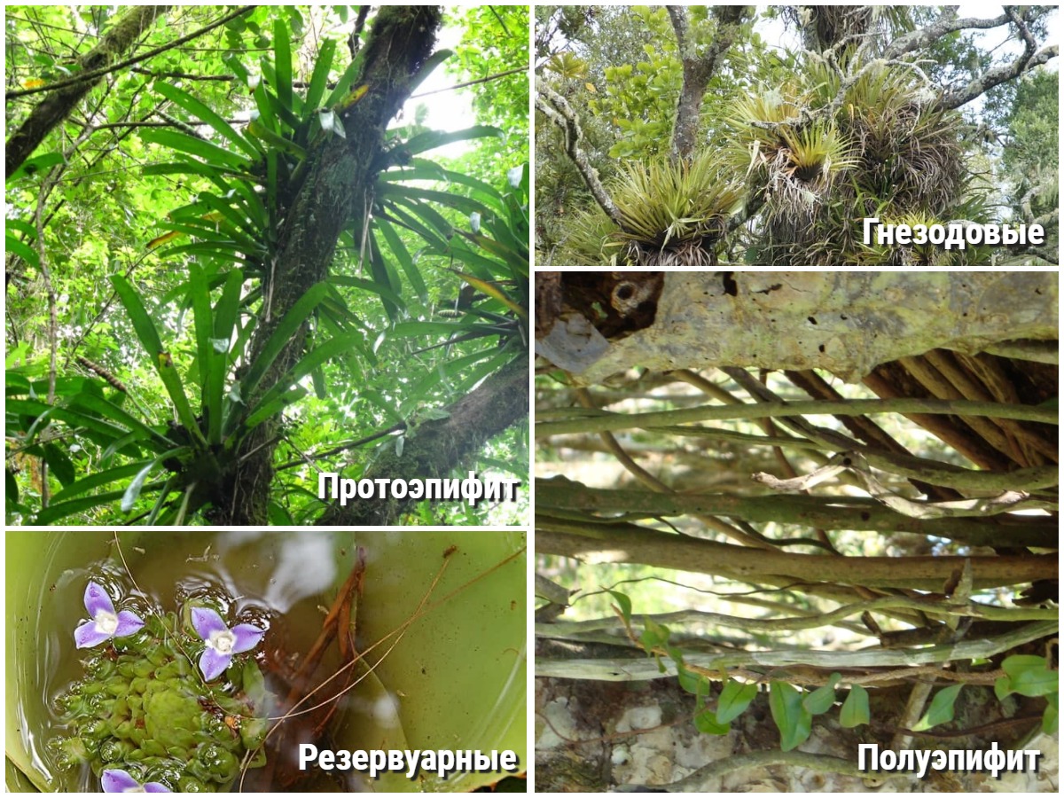 - Третата група съдържа епифити на резервоараТе са отишли още по-далеч в своите адаптивни трикове, вплитайки дебели листа в плътни резервоари. Понякога те побират до 5 литра вода наведнъж. Различни водорасли и бактерии виреят в тях, създавайки уникална микрофлора, която служи като хранителен ресурс.