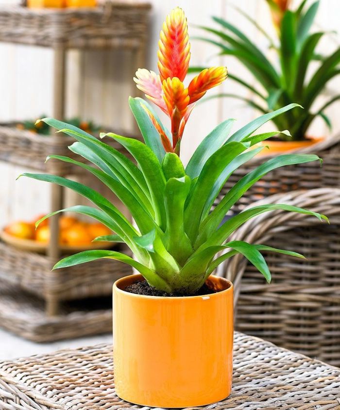 - ГузманияХарактеризира се с ярък прицветник, който може да се предлага в най-различни нюанси. Лесен е за грижи. Не изисква обилно поливане и не се разсажда добре поради крехките си корени.