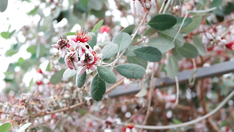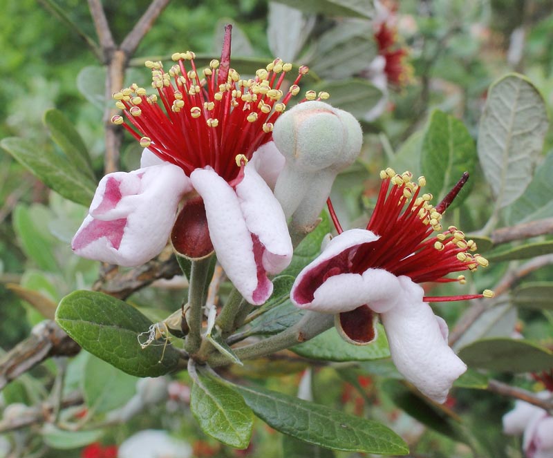Фейхоата цъфти от май до юни-юли. Цветовете са четиричленни, с бели и розови венчелистчета и множество червени тичинки в центъра. Цъфтежът обикновено е продължителен, продължава 3-4 седмици.