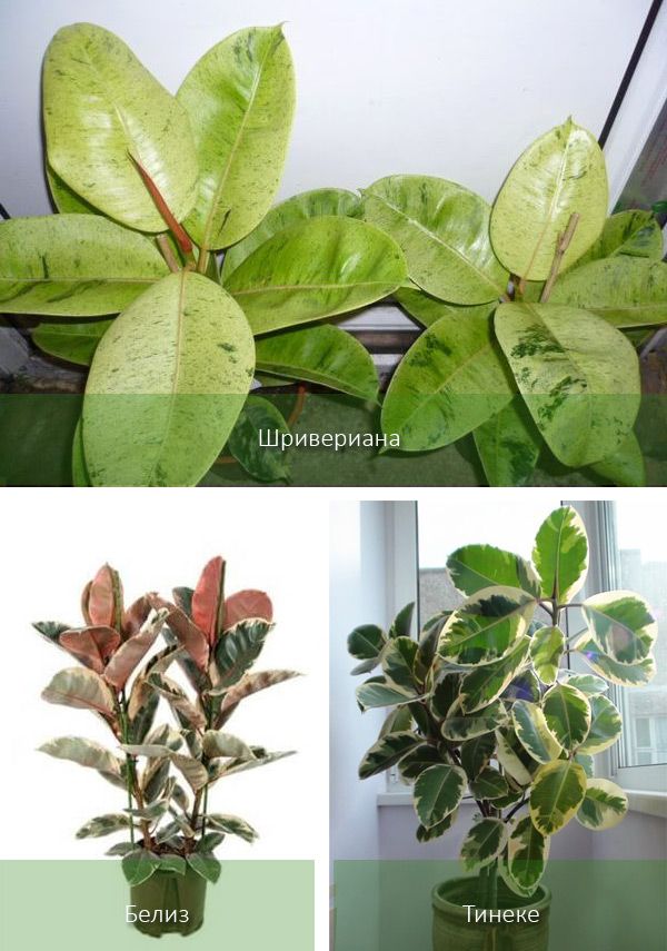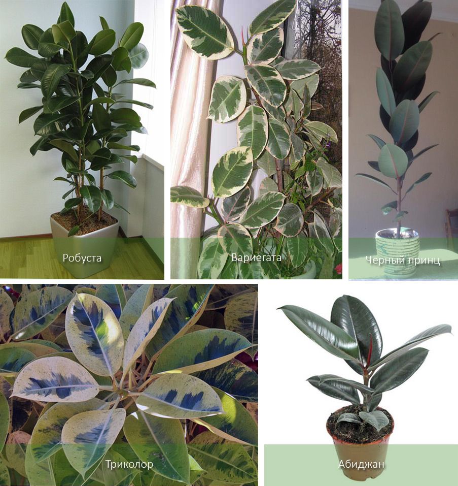 Каучуковото растение има много стайни разновидности, различаващи се по листа, височина на растеж и изисквания за грижа.