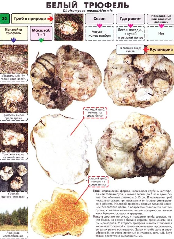 | Бял трюфел (Choiromyces venosus, също Choiromyces meandriformis) | Диаметър от 1 до 7 см, тегло от 8 до 150 г. | Гъбата е ароматна, но вкусът ѝ не е много добър. Използва се за подправки и масла. | Европейска част на Русия, Среден Поволжки регион. |