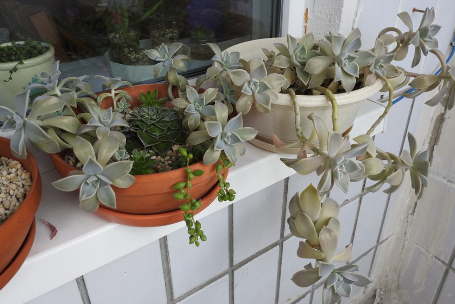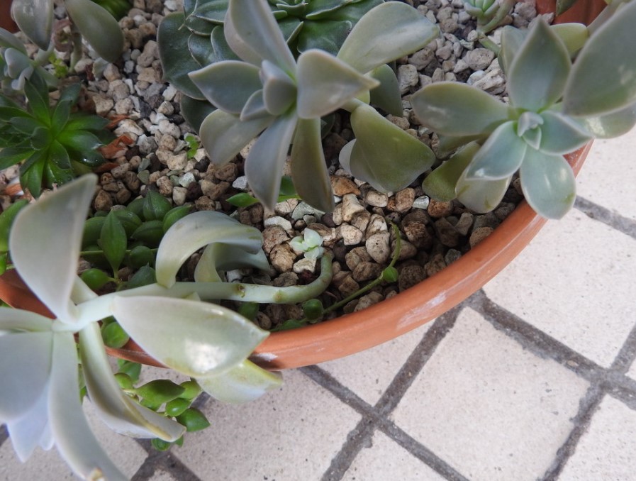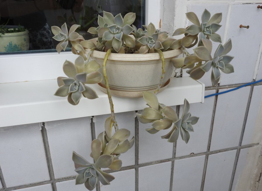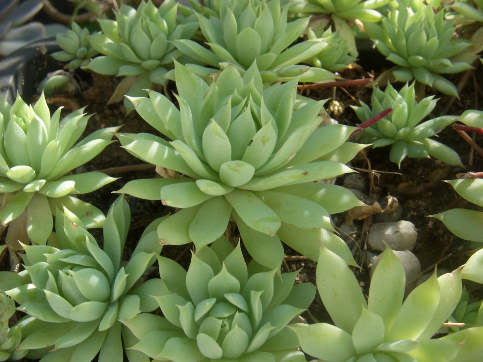 Зелените розетки са от младо растение, което донесох от Бавария. Мисля, че не получава достатъчно светлина тук, затова започва да се свива и разтяга.