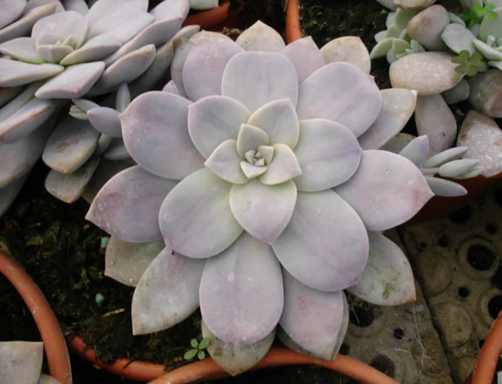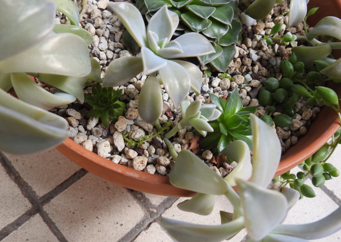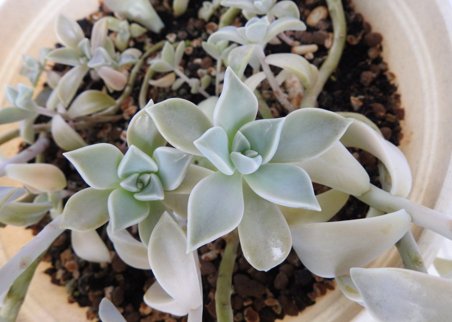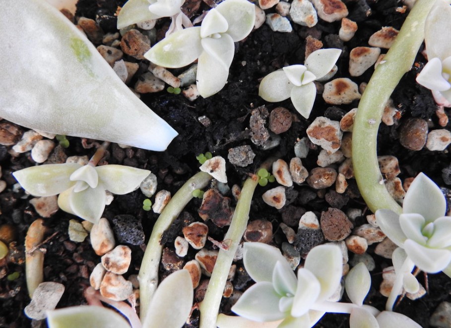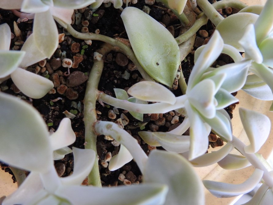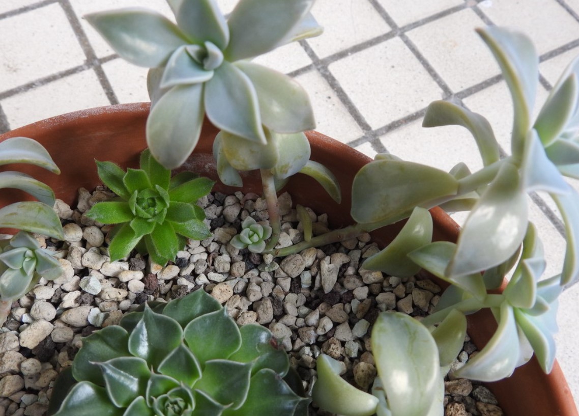 На тази снимка все още можете да видите листата, от които е започнала да расте розетката. Тъмнозеленото растение в средата е Graptopetalum bellum. То расте като единична розетка и образува красиви цветни стъбла.