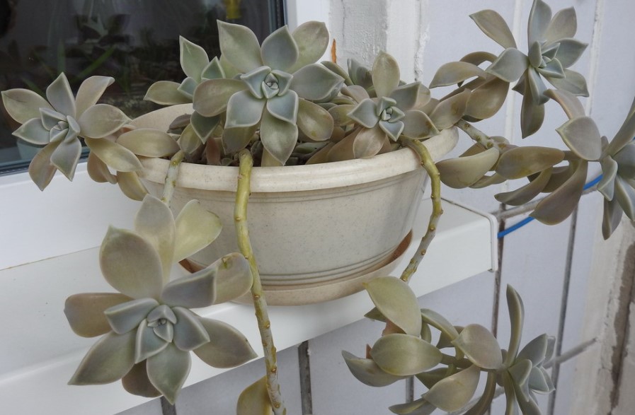 Това е лесният за отглеждане Graptopetalum paraguayense. Поливах го много рядко през зимата. През нощта температурата на балкона беше около 10 градуса, но през деня, на слънце, можеше да се повиши до над 20.