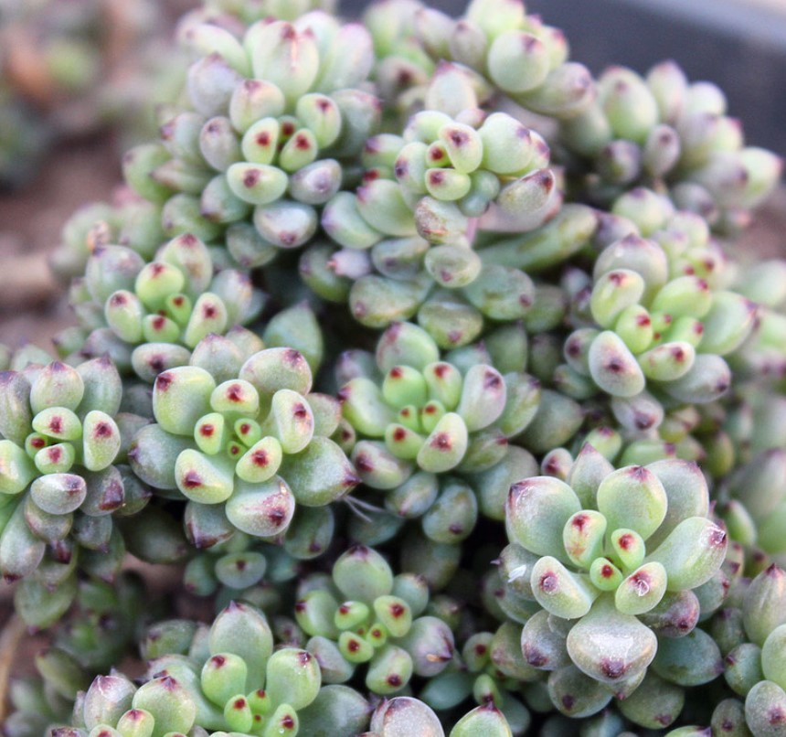 Това е истински вик от сърце. Граптопеталумът „Елън“ е един от любимите ми, но от година не мога да намеря общ език с него. Започнаха да се появяват тези зелени ранички, за които ми казаха, че е воднянка и че трябва да коригирам поливането. Поливам ги всичките според тургора им, а почвата е горе-долу еднаква за всички. Отглеждам потомството от лист. Докато е малко, всичко е наред, но като порасне малко, се появяват тези ранички. Листата съхнат неравномерно, а където има повече ранички, могат да се появят дори точно на върха на розетката, което е ужасна гледка.
