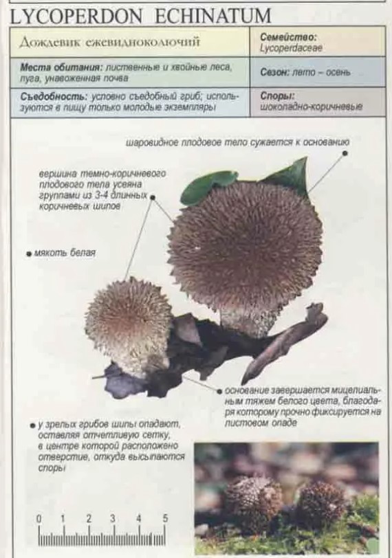 | Формата е бухалковидна, височината на гъбата е от 7 до 15 см. Цветът е светъл, с малки бодли, разположени рядко по повърхността. | юли-октомври | Расте във всички гори, както и по поляни и горски краища. | След отстраняване на екзоперидиума, гъбите могат да се консумират. |