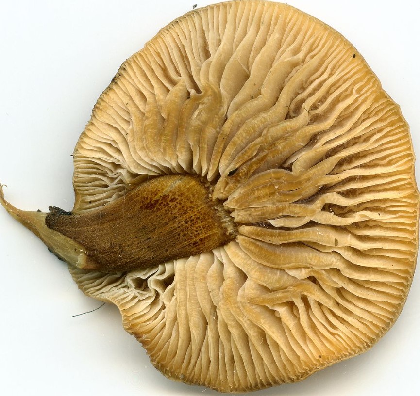 Хрилете са редки, прилепнали и кремави на цвят. С узряването на гъбите те започват да потъмняват.