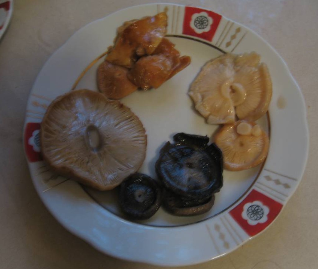 Жълти млечни гъби. Този път имахме малко количество, тъй като ги намерихме на поляна, а не в гъбарник, така че се побираха в малък буркан - идеални за дегустация. Опитахме ги и след две седмици мариноване. Солените млечни гъби бяха вкусни, с лека горчивина; използвахме ги като еталон за останалите гъби.