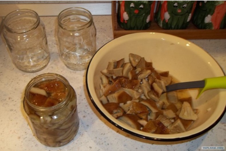 Не уплътнявайте гъбите твърде силно, тъй като е добре да остане малко саламура. Те не са успели да абсорбират солта през краткото време за готвене и ще бъдат готови след няколко дни. Аз изсипвам слой сода бикарбонат отгоре, за да образува филм на повърхността и да блокира въздушния поток.