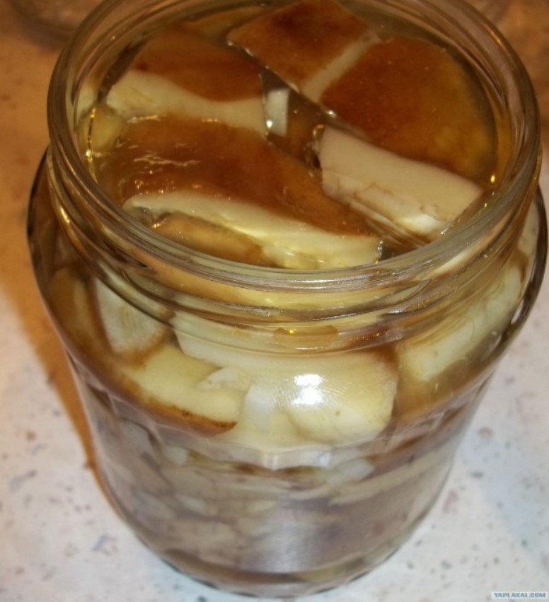 Смесете всички съставки, като добавите само оцета, след като маринатата заври. Извадете дафиновия лист след готвене. Поставете подготвените гъби в буркани, покрити със ситно нарязан чесън, залейте ги с горещата марината и затворете.