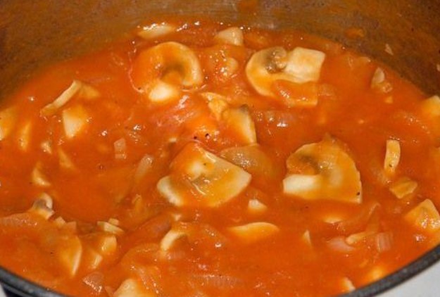 - Добавете подправките, залейте с доматен сос, оставете да заври.