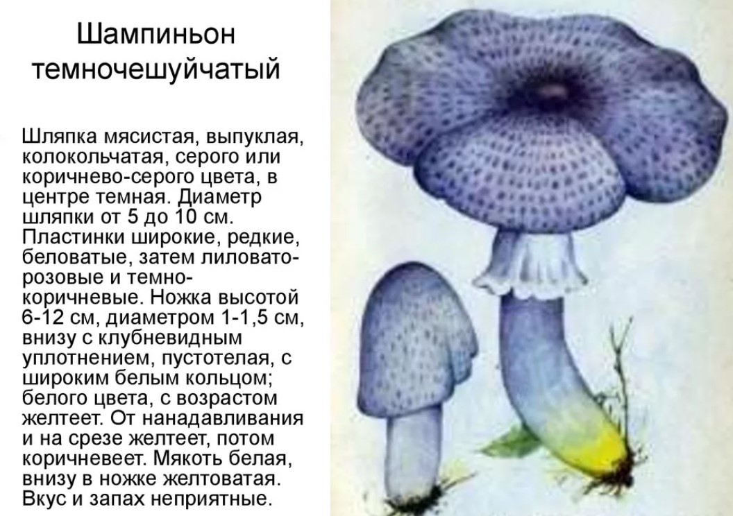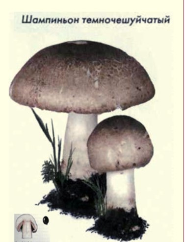 - Тъмен (тъмнолюспест) шампиньон. Гъбата има остър мирис, а месестата част пожълтява на разреза.